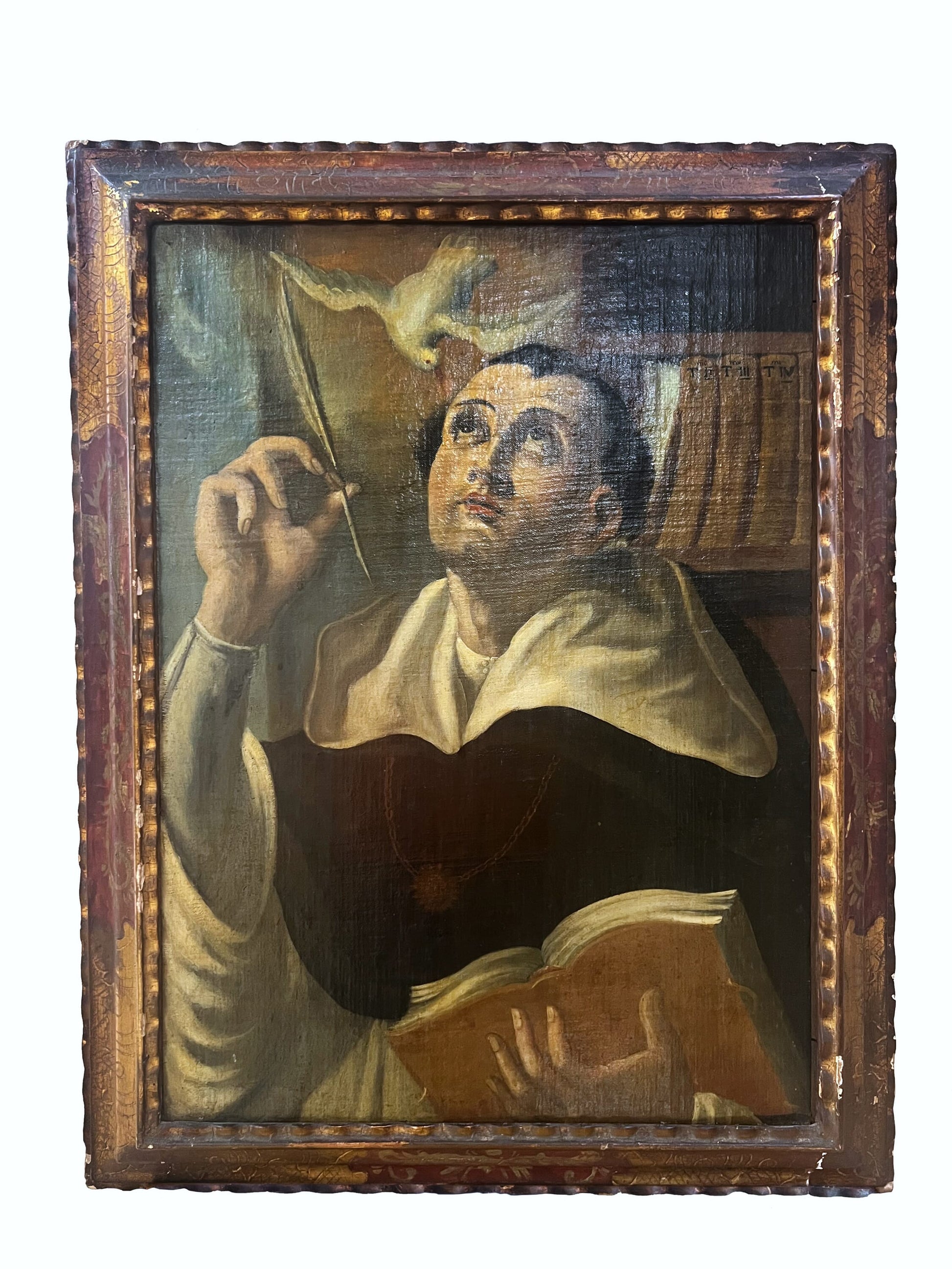 Esta obra se identifica iconográficamente como Santo Tomás de Aquino, el célebre teólogo y filósofo medieval conocido como el "Doctor Angélico".